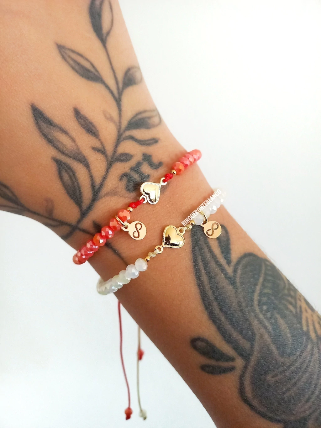Pulsera unitaria de hilo chino con nudo corredizo para ajustar a gusto, cristales de roca, detalles de oro laminado/goldfield18k, Dije corazón e inifinto de oro laminado/golfield18k.